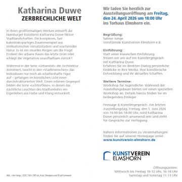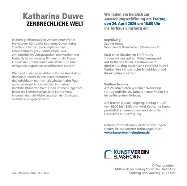 Katharina Duwe ist eine deutsche zeitgenössische Bildende Künstlerin. Sie lebt und arbeitet in Hamburg. Die Malerin verwandelt urbane Räume in malerische Reflexionen unserer Zivilisation. Ihre großformatigen Werke verweben reale Architektur mit fiktiven Elementen – kaleidoskopisch, vielschichtig und tiefgründig. Es geht um das Spannungsfeld zwischen Natur und Stadt, zwischen Lebensraum und Lebensbedrohung. Die kleinformatige Reihe „Lichtreflexe“ widmet sich der Kunstlichtwelt im nächtlichen Stadtraum. Die durch Stadtverkehr und Lichtwerbung erzeugten Lichtreflexe entwickeln im Bild ein Eigenleben, in dem der Farbraum unendliche Variationen möglich macht. Duwes Bilder sind geprägt von der Frage nach der menschlichen Existenz im Ringen zwischen Natur und Zivilisation.